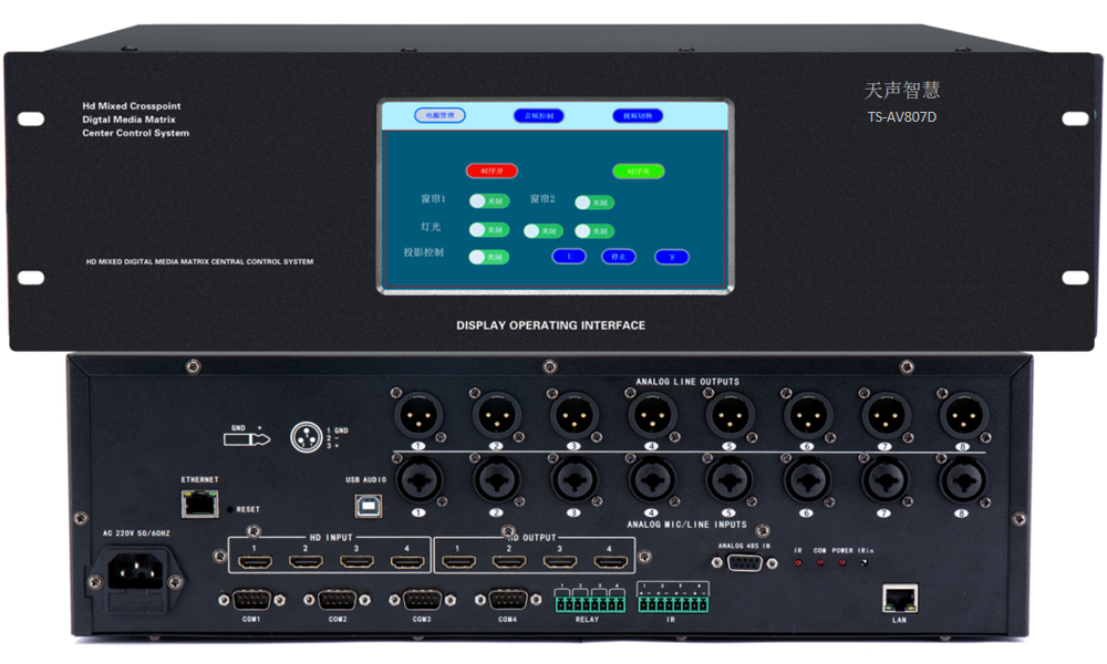 1、自帶7〞液晶觸(chù)摸屏可實現對(duì)音頻大小的控制和視頻輸入輸出交叉切換控制以及其他支持IR\IO\REALY\COM232/485控制的多媒體設備;
